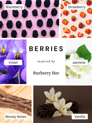Burberry Her by Burberry is a Floral Fruity Gourmand fragrance for women. Burberry Her was launched in 2018. The nose behind this fragrance is Francis Kurkdjian. Top notes are Strawberry, Raspberry, Blackberry, Sour Cherry, Black Currant, Mandarin Orange and Lemon; middle notes are Violet and Jasmine; base notes are Musk, Vanilla, Cashmeran, Woody Notes, Amber, Oakmoss and Patchouli.